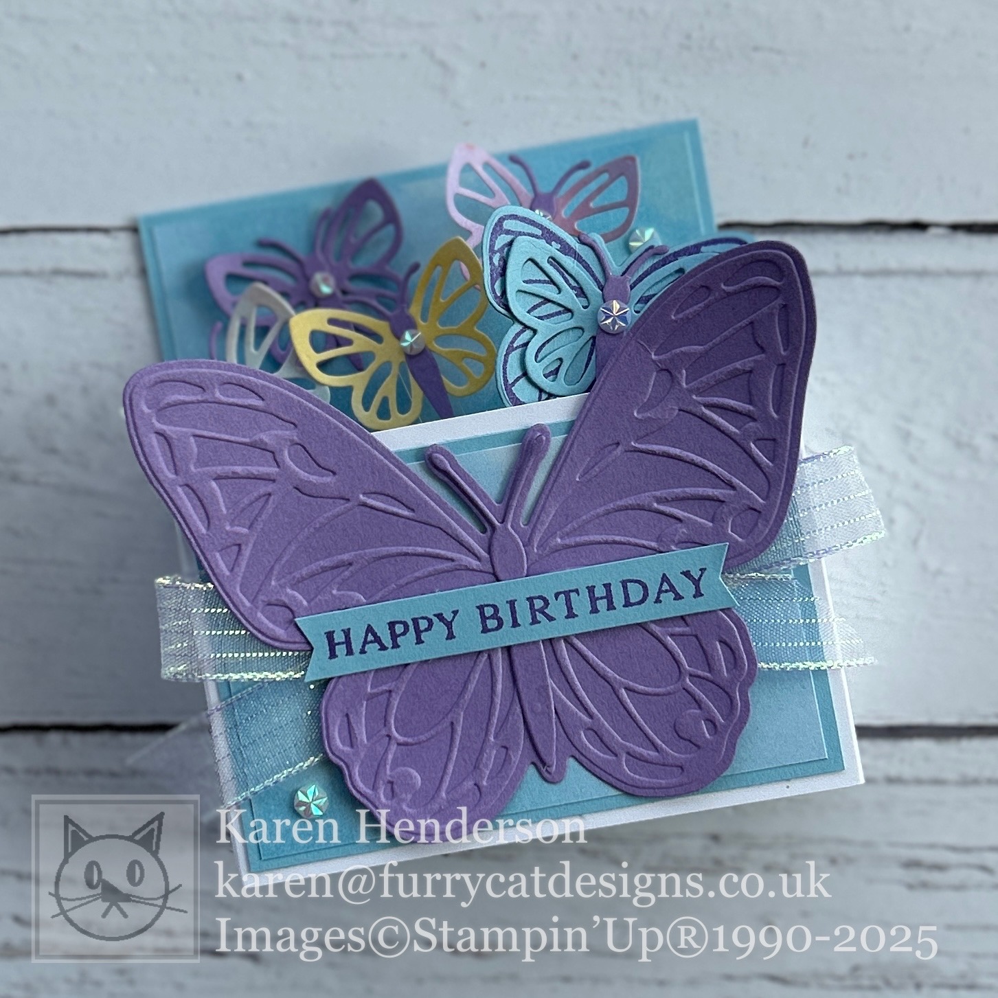 My card flattens to go in an envelope and has cute floating butterfies supported on thin strips of window sheet to give the illusion of flying butterflies. They are attached to an invisible, additional strip of card on the inside so that there is depth to their flight.